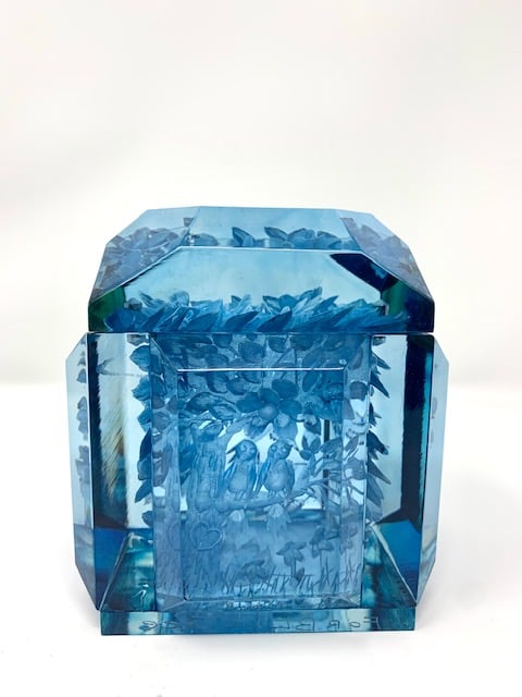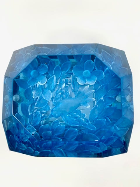 The Classic. Hand carved and hand dyed, this jewel cut Petite Box was the first shape commissioned for Blue Tree. Lush carvings of tree and leaves, flowers and birds in a true Aqua.