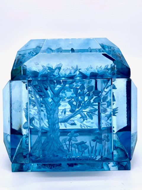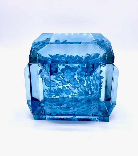 This box shows Joyce's carvings at her best. Classic Blue with trees, birds, and lush flowers! In classic blue (a true, saturated aqua)