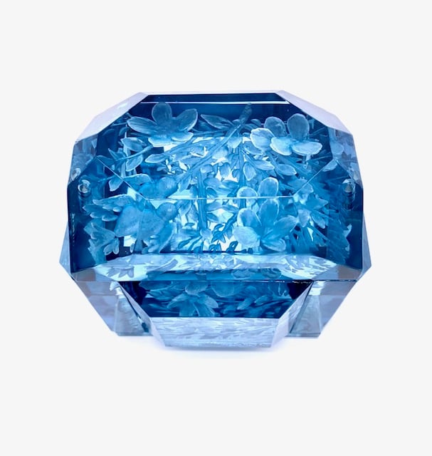 Joyce Francis is a Manhattan based artist who hand carves Lucite using twenty five different sized dentist drills in a medium referred to as "cold carving". She is self-taught. Each box or bag is a one of a kind piece of art and they are all exclusive works for the store Blue Tree. There are no embedded objects in any of her work. Joyce's purses are in the permanent collection of costume exhibits at both the Victoria Albert Museum of London and The Metropolitan Museum of Art in New York. Joyce is also the winner of the prestigious Gladys Blum Award from The National Academy of Fine Arts.