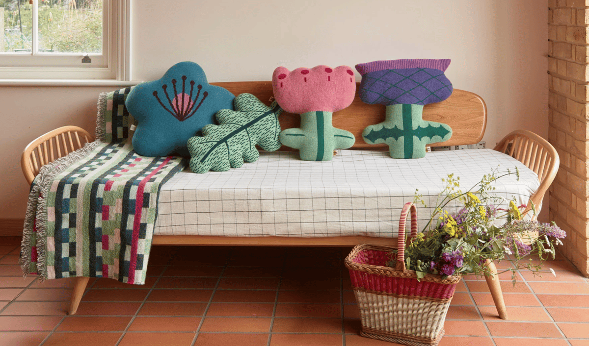 This new Flower shaped pillow comes in Purple Thistle 98.3" x 21" x 3.2")or the oversized Bloom version, which comes in mustard (21" x 20" x 3.9")